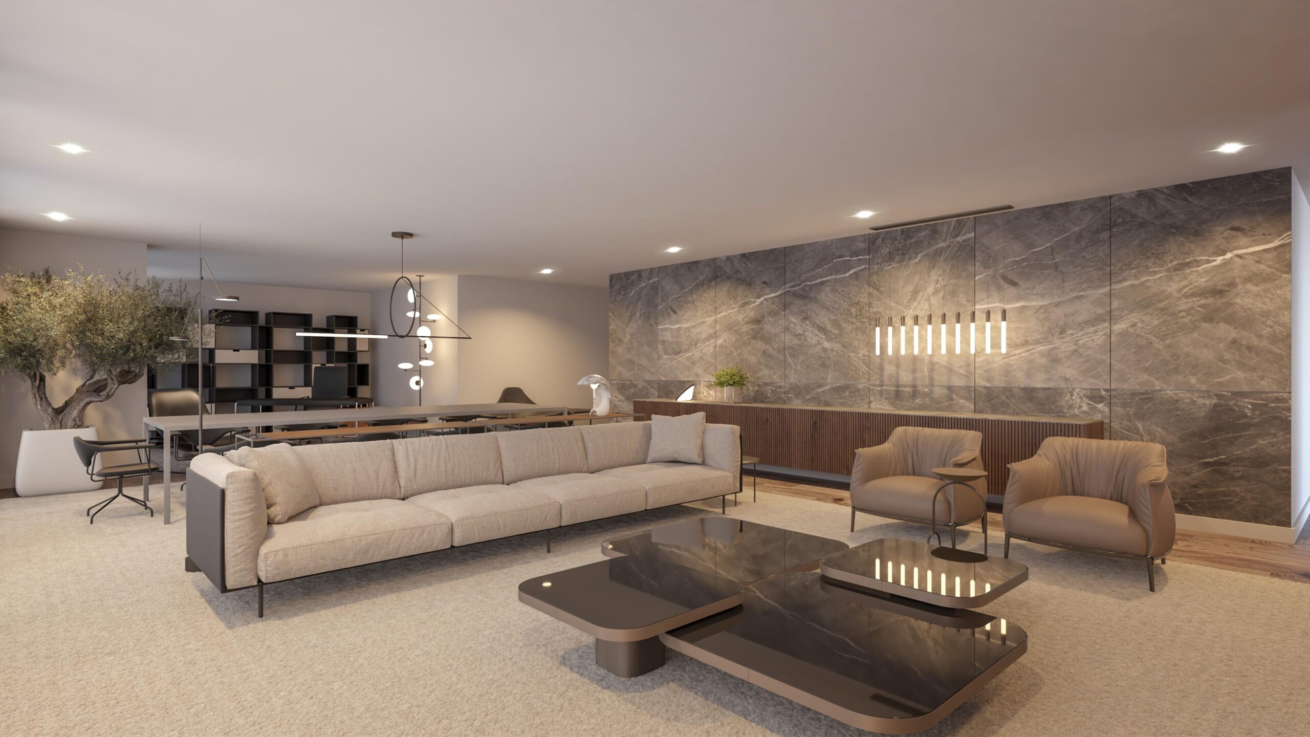 Um espaço inundado de luz natural onde todas as áreas foram projetadas de modo a garantir as funcionalidades necessárias numa atmosfera quente, muito moderna e confortável.