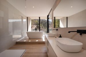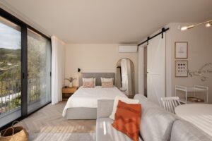A paleta cromática neutra — dominada por tons de branco, cinza suave, terracota e madeira clara — cria uma atmosfera serena e contemporânea. O design de interiores combina funcionalidade com estética minimalista, destacando-se pela escolha criteriosa de materiais e texturas: tecidos naturais, espelhos arqueados e detalhes em dourado que conferem sofisticação. Cada elemento foi pensado para proporcionar conforto, beleza e uma experiência imersiva na natureza. O resultado é um espaço intimista e inspirador, perfeito para quem procura tranquilidade, estilo e autenticidade no Gerês.