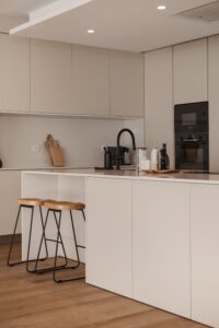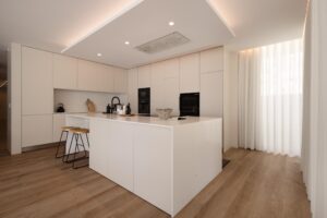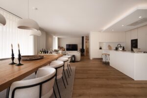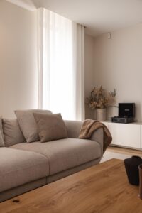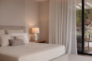 Os interiores refletem a serenidade e o equilíbrio da envolvente natural, com uma paleta de tons neutros que transmite conforto e sofisticação. Materiais orgânicos como a lã e o linho foram cuidadosamente selecionados para criar uma atmosfera acolhedora e sensorial, capaz de abraçar tanto os dias quentes de verão como os momentos introspectivos do inverno.