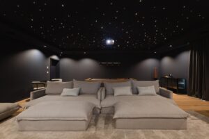 A sala de jogos e de cinema rompe intencionalmente com o estilo decorativo do restante projeto, oferecendo uma linguagem mais lúdica e funcional, pensada para responder às exigências específicas dos utilizadores. No exterior, os jardins e a piscina prolongam a experiência de bem-estar, criando zonas de lazer que dialogam com a arquitetura e o território.