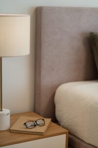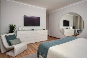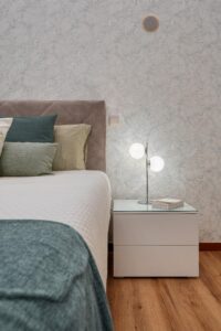 Para a suíte pretendeu-se um ambiente calmo, mas acolhedor, traduzido na escolha criteriosa da palete de cores, assim como na seleção de peças de mobiliário de linhas minimalistas, contrapondo com a inclusão de papel de parede e elementos têxteis de diferentes texturas. O espaço também se destaca pela instalação de cortinas de abertura elétrica. A casa-de-banho foi também intervencionada, com a inclusão de um novo revestimento, mobiliário e acessórios de tons neutros, destacando-se a escolha de pavimento vinílico de acabamento carvalho natural. A criação de uma sanca de luz em todo o perímetro da casa-de-banho, assim como a opção por espelhos com iluminação integrada, ajudaram a ampliar e potenciar a escolha de materialidades e as suas texturas.