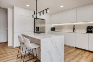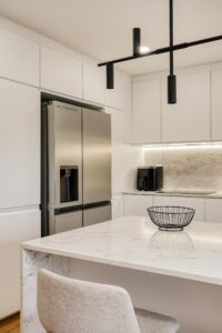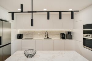 O projeto desenvolvido privilegiou a criação de um ambiente elegante & contemporâneo, onde o design e a funcionalidade estivessem presentes. A escolha de mobiliário de linhas depuradas, contrasta com a seleção de pavimento vinílico efeito carvalho natural e com os tampos calacatta, que se assumem como protagonistas, complementados por apontamentos em preto, para um resultado intemporal e sofisticado.