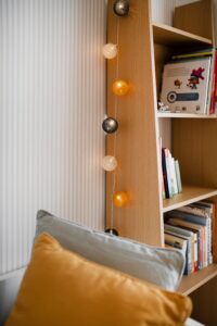 Os tons neutros com toques de amarelo criam uma atmosfera leve e acolhedora, perfeita para inspirar momentos de brincadeira e descanso. A aplicação de papel de parede de tons creme e a seleção de elementos têxteis com diferentes texturas, acrescentaram conforto e serenidade, ajudando a ligar os diferentes elementos existentes no espaço.