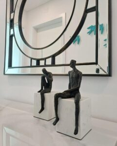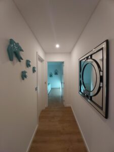 O hall de circulação foi valorizado com elementos decorativos discretos mas expressivos, transformando uma zona de passagem num espaço com identidade própria. O jogo de espelhos e peças escultóricas contribui para a perceção de amplitude e continuidade do projeto.