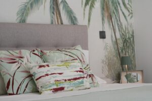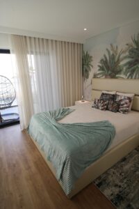 A paleta cromática suave, dominada por tons neutros e verdes água, reforça a sensação de tranquilidade e continuidade entre os espaços. No quarto, o papel de parede tropical torna-se o elemento de destaque, trazendo profundidade e personalidade sem comprometer a serenidade do ambiente. Os têxteis cuidadosamente selecionados acrescentam textura e conforto, elevando a experiência de descanso.