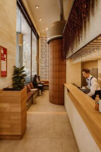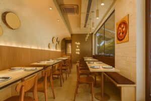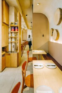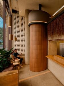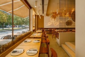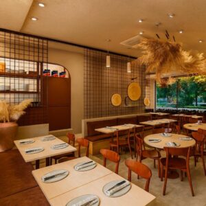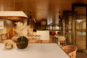 Tons quentes, texturas naturais e soluções técnicas discretas moldam uma atmosfera que valoriza a experiência sensorial, tanto no prato como no espaço. Um projeto onde cada pormenor foi desenhado para refletir a identidade da marca e criar uma verdadeira imersão gastronómica.
