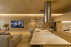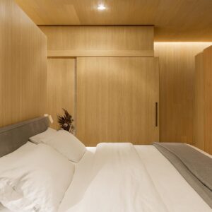 Neste projeto, uma antiga loja de rua foi transformada num T0 funcional que se apresenta como um T1, graças à inteligente disposição do mobiliário e à fluidez do layout. A proposta conjuga tons quentes de madeira natural, iluminação embutida e soluções de arrumação integradas para criar uma atmosfera serena e acolhedora. A zona de estar, cozinha, dormitório e até um home office surgem discretamente articulados, sem perder a sensação de amplitude. Uma obra que valoriza cada metro quadrado, elevando o quotidiano através do design.
