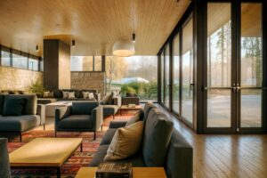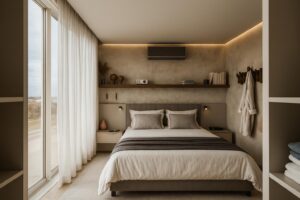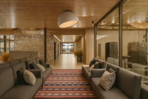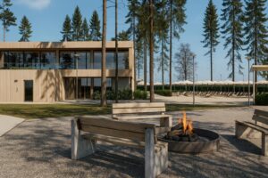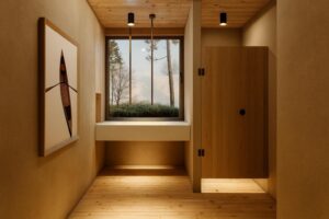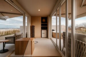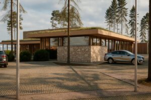 Este projeto para um Centro Náutico na Macedônia do Norte propõe uma arquitetura que funde funcionalidade e sofisticação com a atmosfera acolhedora de um resort. Com volumes de linhas contemporâneas e materiais naturais como madeira, pedra e vidro, os edifícios dialogam com a paisagem envolvente, integrando-se de forma orgânica à floresta e à linha d’água. Os espaços comuns — incluindo lounges, restaurante, hall, e áreas de lazer interior e exterior — foram pensados para promover bem-estar, contemplação e convívio, com interiores confortáveis, luminosos e envolventes. O projeto valoriza a experiência do utilizador em todas as escalas, desde o acolhimento caloroso à beira do lago até ao conforto das áreas privadas, traduzindo-se numa proposta elegante, contemporânea e fortemente enraizada no local.
