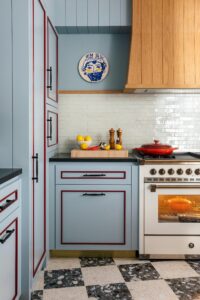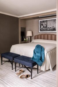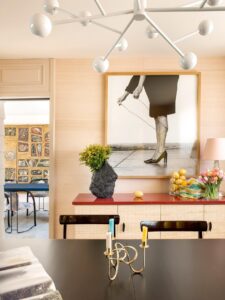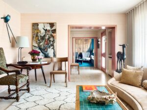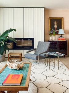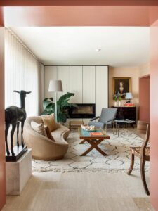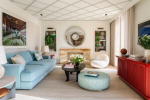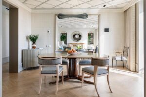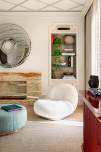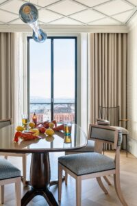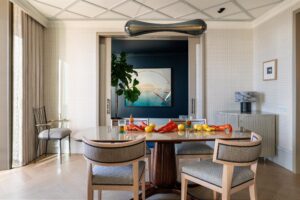 Móveis e objetos decorativos são selecionados a partir de peças de autor, itens históricos distintos e impressionantes obras de arte, realçando a individualidade e o conforto do apartamento. Esta seleção cuidadosa cria uma atmosfera intemporal que mistura detalhes históricos e clássicos com um estilo jovem, alegre e refrescante.