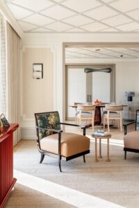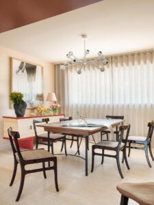 Enquanto a arquitetura original foi mantida, os interiores foram totalmente renovados. A estética midcentury, característica dos anos 50, está presente em vários elementos, transmitindo o charme da época. Fiel ao ADN da Ding Dong, a decoração combina peças inesperadas, criando um equilíbrio entre memória e contemporaneidade.