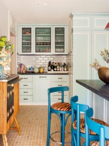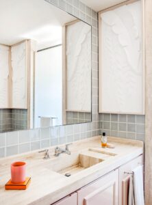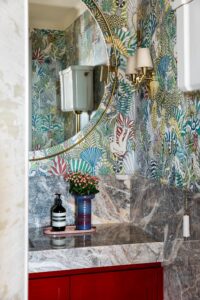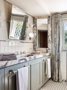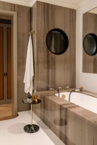 A altura excecional do teto do apartamento e os elementos decorativos pré-existentes são destacados para preservar o seu charme intrínseco. Uma seleção cuidadosa de materiais, desde mármore e granito até seda e veludo, tece uma tapeçaria rica pelos interiores. Papel de parede pintado à mão e azulejos artesanais acrescentam toques personalizados, enquanto a madeira natural e lacada oferece um equilíbrio entre tons neutros e contrastantes.