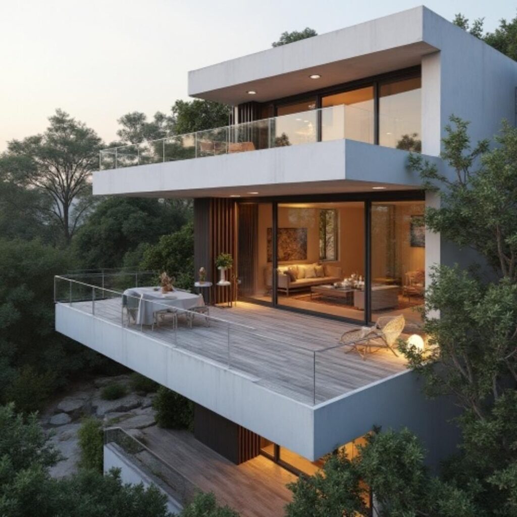 Um projeto contemporâneo de luxo que combina design moderno com funcionalidade. Optámos por uma estética minimalista e uma forte integração com o exterior. Escolhemos uma parede verde vertical na lateral que adiciona um toque ecológico, promovendo isolamento térmico e estética sustentável.