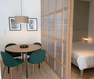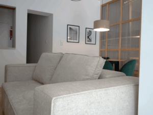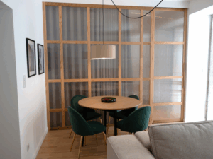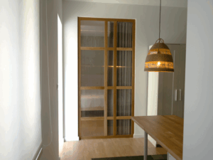 Um projeto de design concebido para um apartamento em pleno coração de Lisboa. O desafio deste projeto foi o da optimização de um espaço pequeno, neste caso a sala. Este apartamento contém uma excelente luminosidade, e para aproveitar este componente desenhou-se uma estrutura toda em carvalho, com vidro canelado, onde esta funciona como peça decorativa no espaço e ao mesmo tempo como parede divisória para um quarto.
