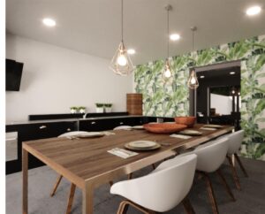 Projeto contemporâneo que combina elegância, funcionalidade e uma forte ligação à natureza envolvente. Utilizámos um design que valoriza a modernidade e o bem-estar. Estilo contemporâneo com influências tropicais, refletindo uma tendência atual no design de interiores. A nossa escolha em utilizar papel de parede de folhas verdes trouxe um toque exótico, contrastando com as superfícies neutras e a