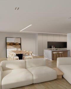 Um projeto de design contemporâneo e minimalista, caracterizado por uma estética clean e luminosa que privilegia a integração harmoniosa entre espaços interiores e exteriores. Valorizámos o uso de materiais naturais, linhas retas e uma paleta de cores neutras para captar a luz. Acrescentámos a este projeto, uma obra de arte em grande formato, na parede, o que adiciona um toque cultural, ancorando o espaço.