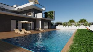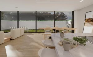 Um projeto contemporâneo de luxo que combina design moderno com funcionalidade. Optámos por uma estética minimalista e uma forte integração com o exterior. Escolhemos uma parede verde vertical na lateral que adiciona um toque ecológico, promovendo isolamento térmico e estética sustentável.