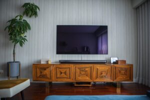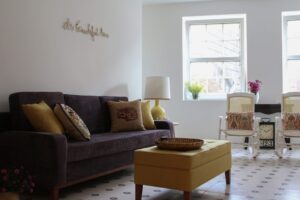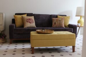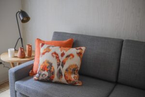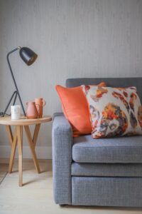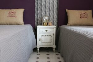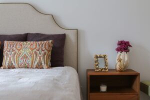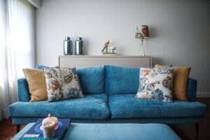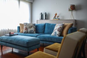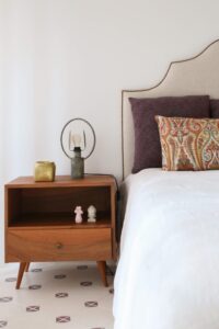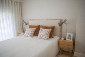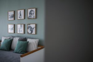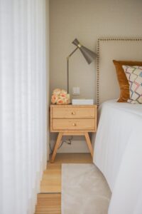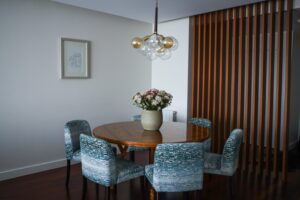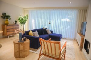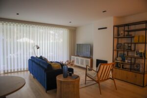 Projetado para um casal americano a residir em Portugal, este projeto alia simplicidade, materiais naturais e sofisticação. A partir de uma base neutra em cada divisão, surgem pontos de cor que acrescentam dinamismo e interesse ao ambiente. Um exemplo é o sofá em veludo azul, que cria contraste cromático e se afirma como peça central da área de estar, acompanhado pela poltrona em madeira natural e pelo aparador de linhas modernas.