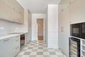A cozinha de linhas minimalistas, combina tons neutros, puxadores dourados e o padrão do pavimento em xadrez que conjuga o estilo vintage com o contemporâneo.