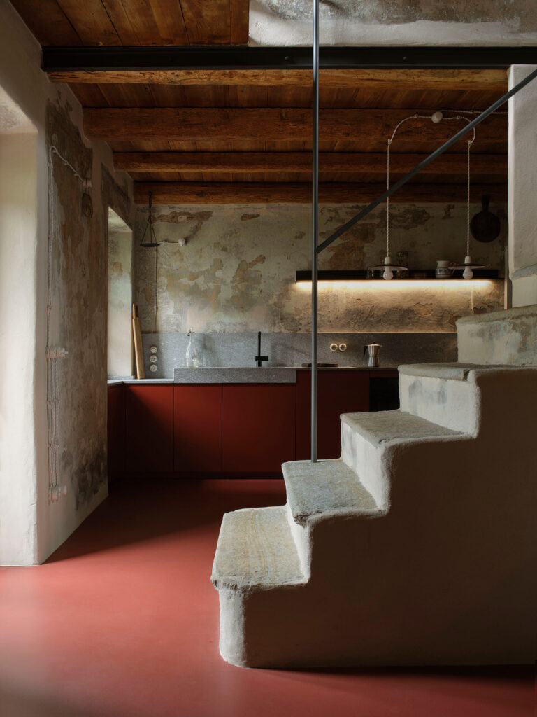 O vermelho da resina pompeiana, em contraste com o ferro escuro dos corrimões e das estruturas metálicas, atua como fio condutor, sublinhando as intervenções contemporâneas e revelando a passagem do tempo com elegância.