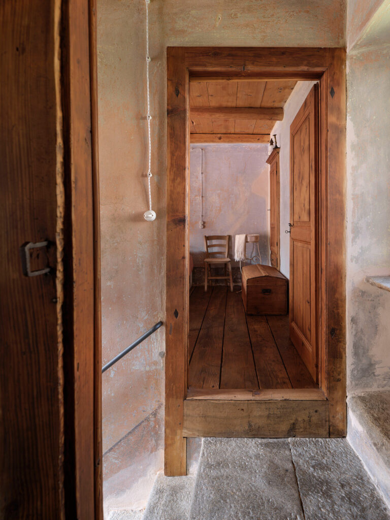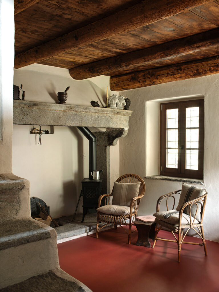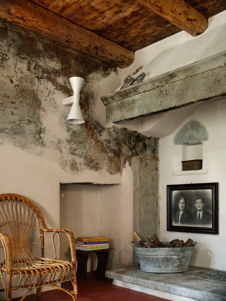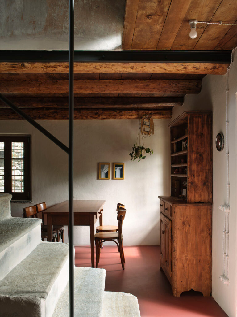 A cozinha, com a sua lareira monumental — o coração da casa —, foi transformada num acolhedor espaço de convívio, ideal para conversas e jantares entre amigos. Cada detalhe, dos pavimentos e tetos em larício, nogueira e castanheiro à pátina do tempo que cobre cada superfície, foi tratado com cuidado artesanal. As vigas, outrora enegrecidas pelo fumo ou branqueadas pela cal, foram recuperadas por mãos experientes.
