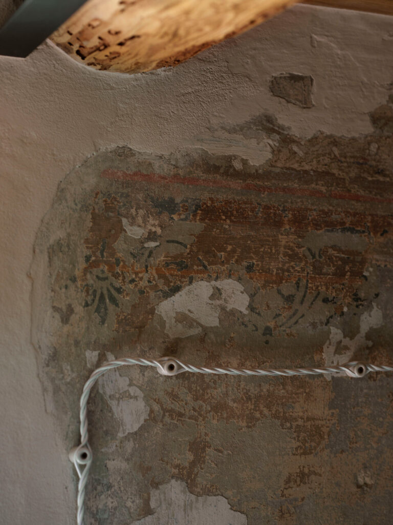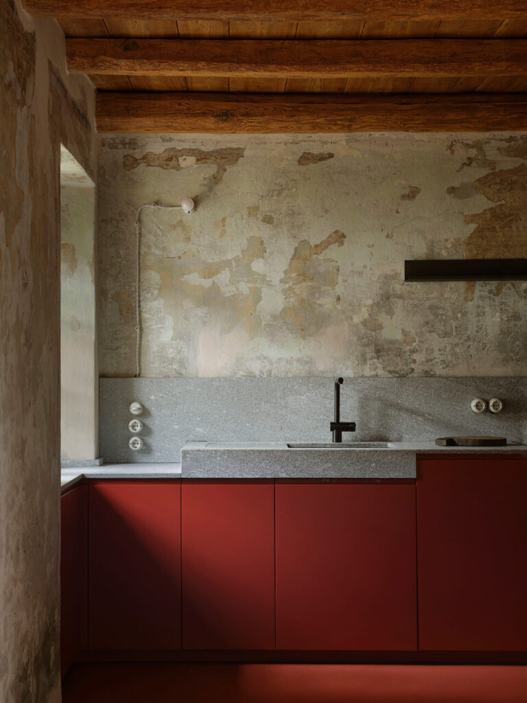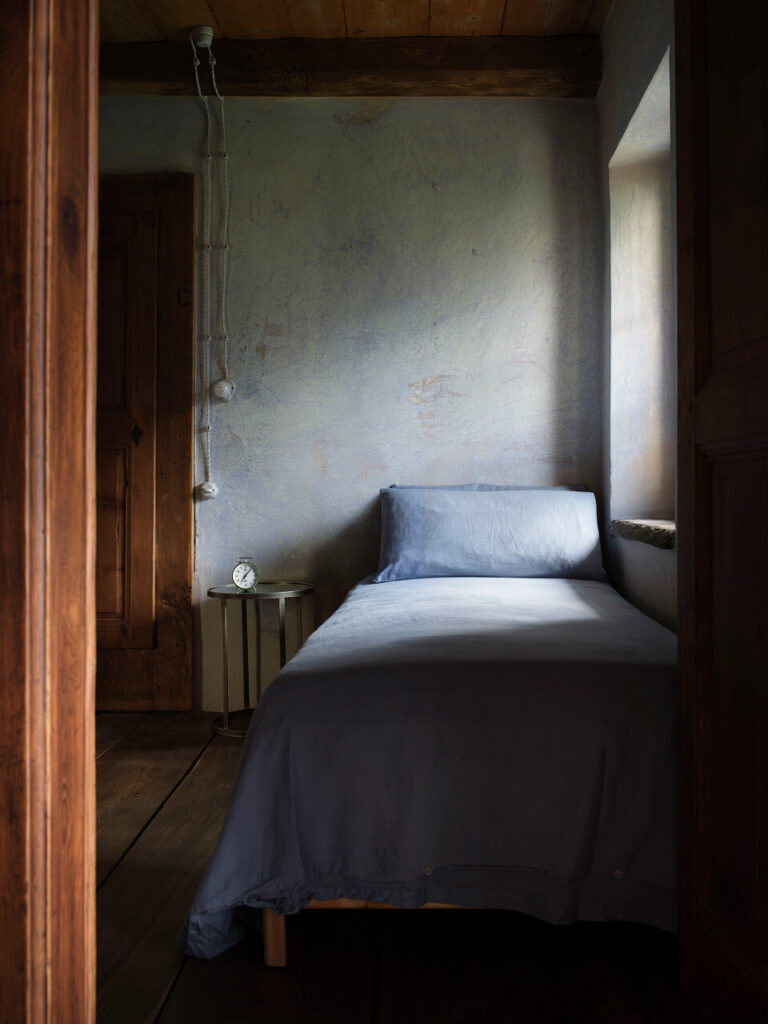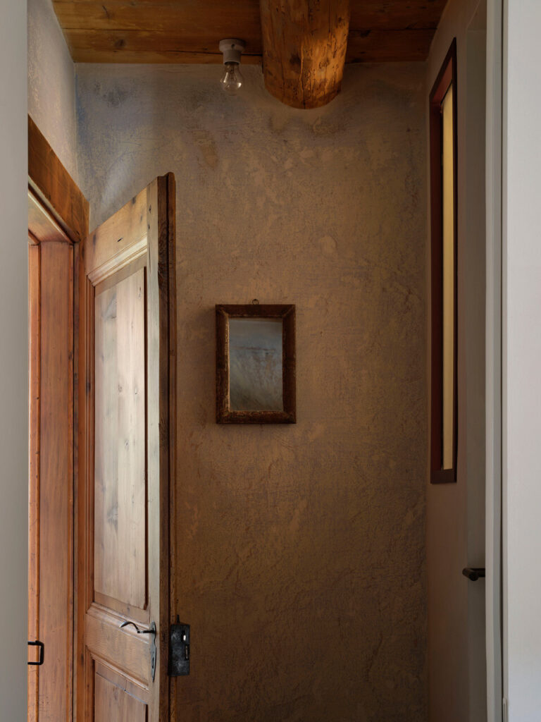 A cozinha, com a sua lareira monumental — o coração da casa —, foi transformada num acolhedor espaço de convívio, ideal para conversas e jantares entre amigos. Cada detalhe, dos pavimentos e tetos em larício, nogueira e castanheiro à pátina do tempo que cobre cada superfície, foi tratado com cuidado artesanal. As vigas, outrora enegrecidas pelo fumo ou branqueadas pela cal, foram recuperadas por mãos experientes.