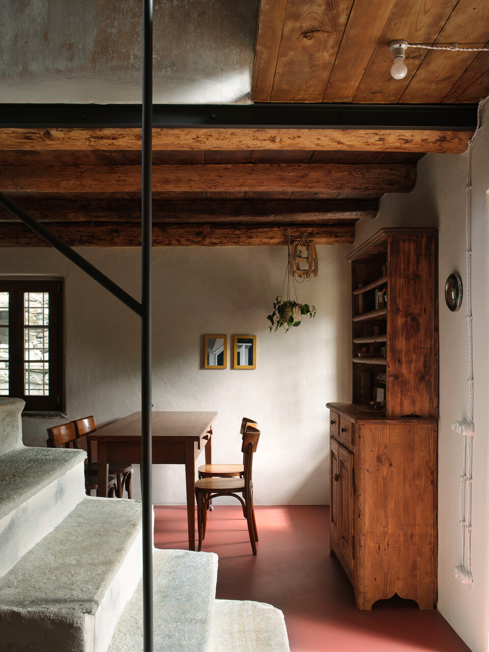A escada, íngreme e imponente, ganhou destaque: tornou-se o elemento central da narrativa arquitetónica, ligando os pisos e preservando o seu caráter original. As novas aberturas, criadas para permitir a passagem da luz entre a sala e a cozinha, deram-lhe protagonismo e profundidade.