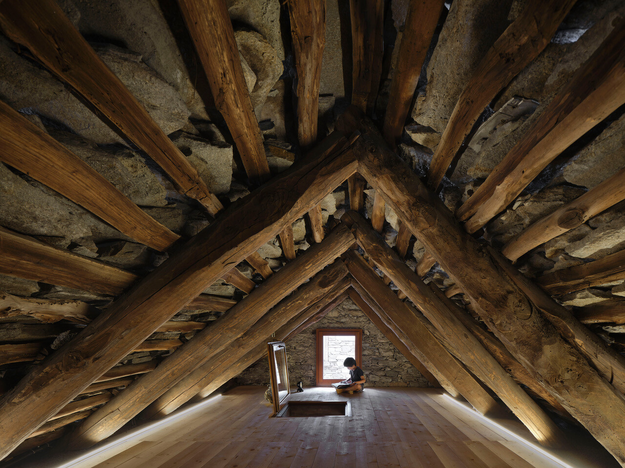 Apesar da robustez exterior, feita de pedra local, o interior esconde um coração de madeira acolhedor, que pode servir de quarto extra no verão ou de espaço lúdico.