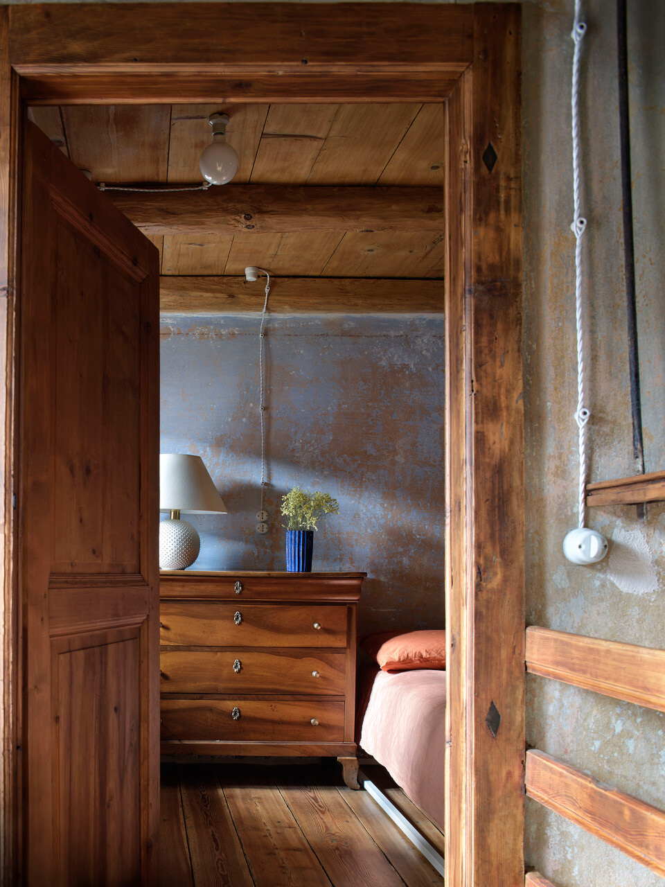 A cozinha, com a sua lareira monumental — o coração da casa —, foi transformada num acolhedor espaço de convívio, ideal para conversas e jantares entre amigos. Cada detalhe, dos pavimentos e tetos em larício, nogueira e castanheiro à pátina do tempo que cobre cada superfície, foi tratado com cuidado artesanal. As vigas, outrora enegrecidas pelo fumo ou branqueadas pela cal, foram recuperadas por mãos experientes.