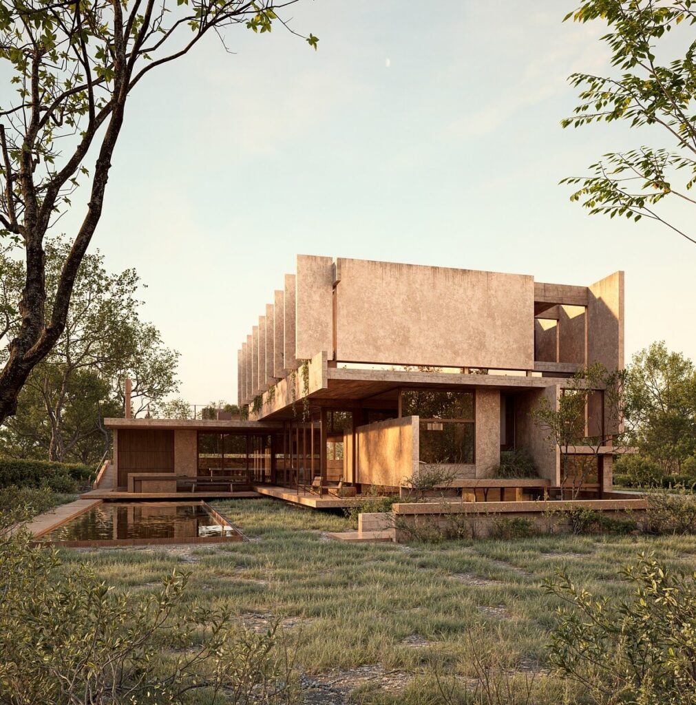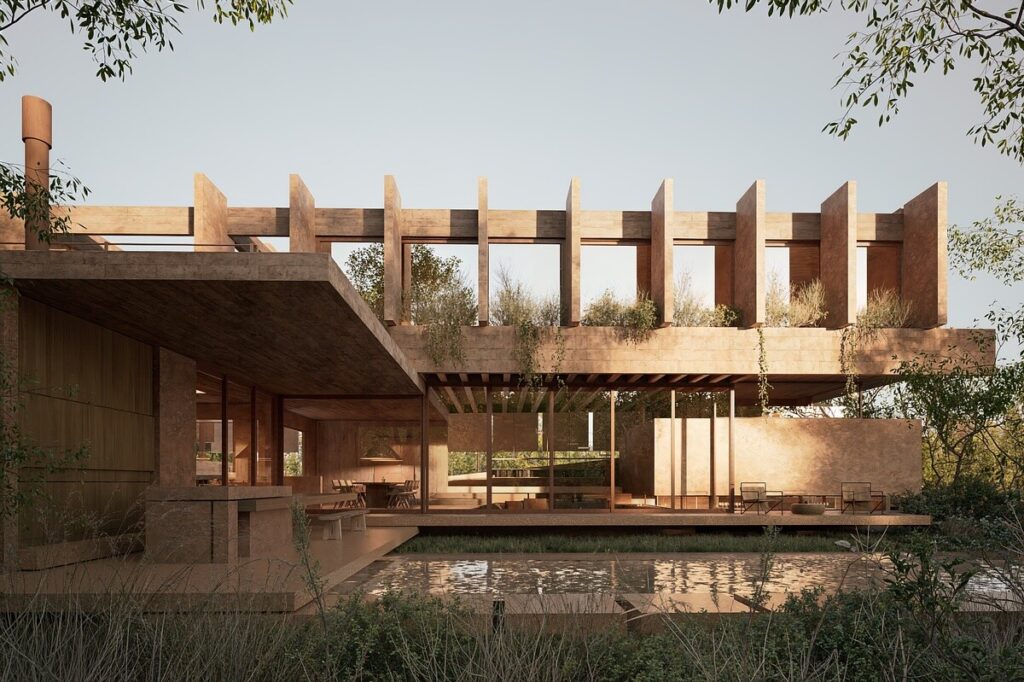 Há uma brutalidade poética nesta casa em cor terracota, que a coloca num limiar entre o conforto de um lar e a singularidade de uma escultura habitável. O Grizzo Studio assina o projeto de arquitetura.