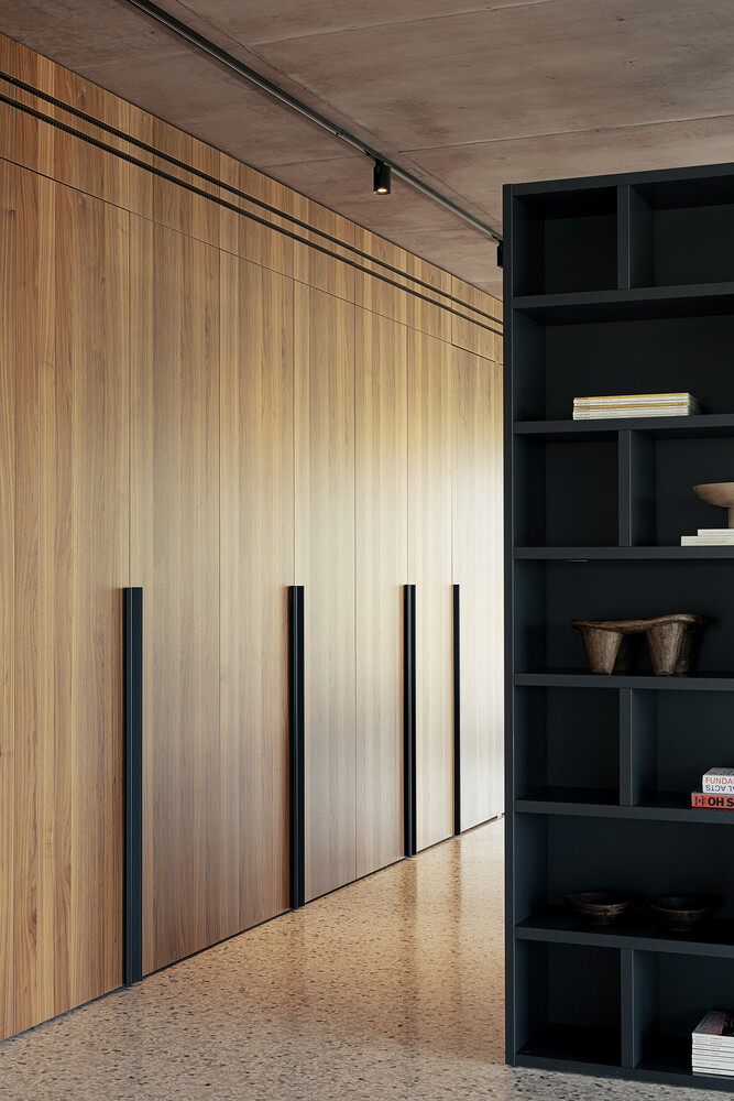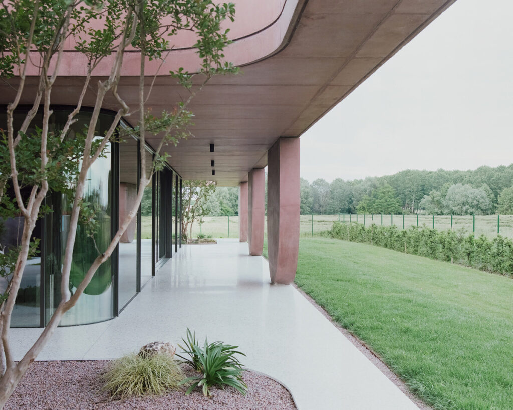 A paleta de materiais foi deliberadamente contida para reforçar a clareza conceptual do projeto: vidro, madeira e um betão de tom avermelhado, todos harmonizados através do pavimento em terrazzo veneziano, que confere continuidade entre os espaços interiores e exteriores.