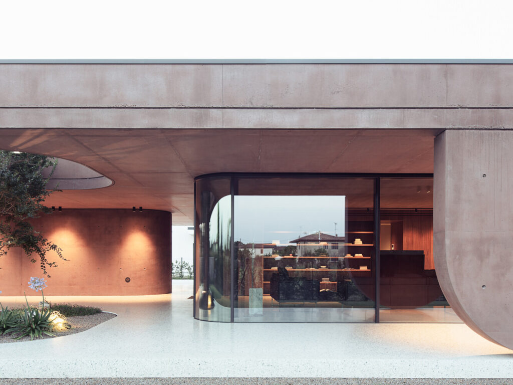 A paleta de materiais foi deliberadamente contida para reforçar a clareza conceptual do projeto: vidro, madeira e um betão de tom avermelhado, todos harmonizados através do pavimento em terrazzo veneziano, que confere continuidade entre os espaços interiores e exteriores.