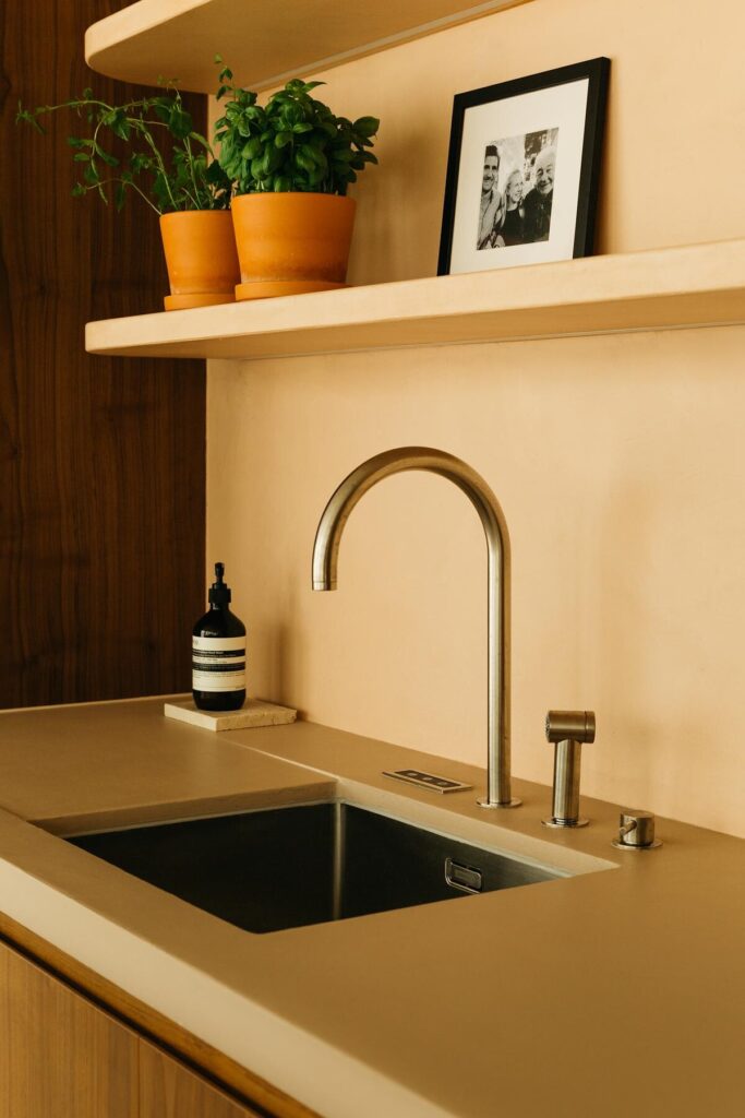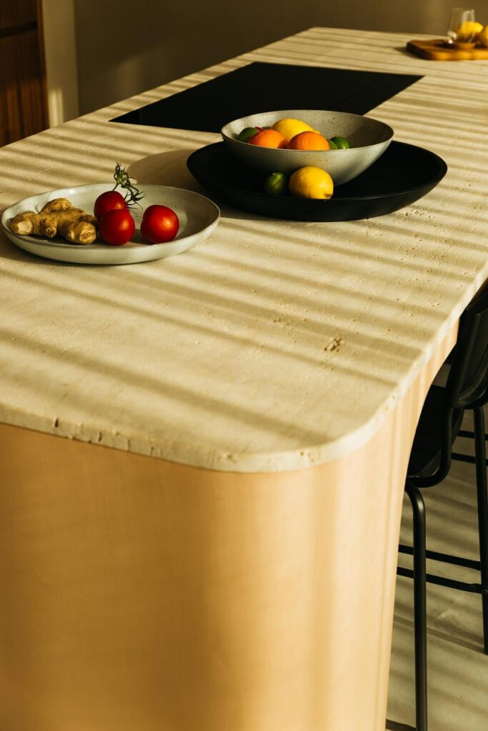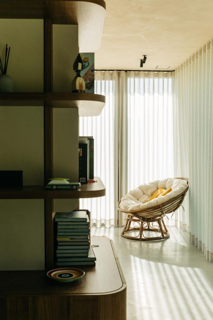 As cores quentes, inspiradas nos pores do sol mediterrânicos, criaram uma ligação imediata às recordações da família. Já os cantos levemente arredondados em cada forma retangular conferiram um detalhe subtil que quebra a rigidez geométrica e guia o olhar com delicadeza pelos espaços.