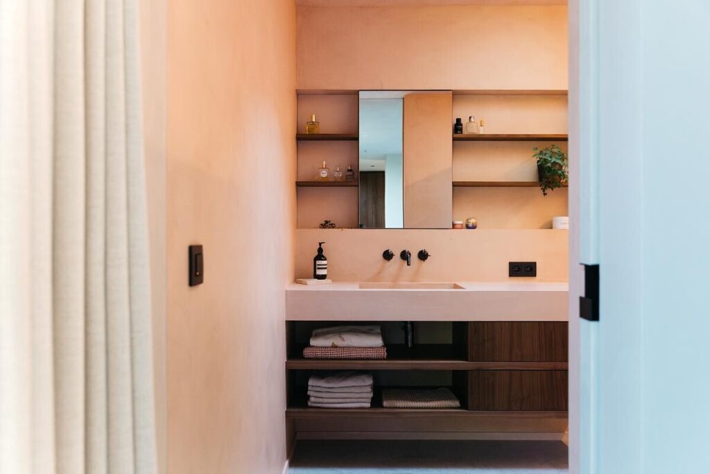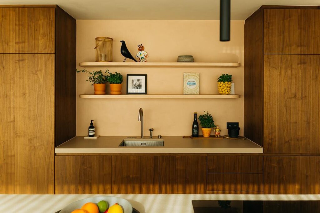 A filosofia Wabi-sabi, que valoriza a beleza da imperfeição e celebra os materiais naturais, serviu de fio condutor ao projeto. A madeira escura trouxe carácter e aconchego, o estuque de cal evocou as texturas das casas tradicionais italianas e o travertino em bruto, usado na cozinha, reforçou uma autenticidade robusta e intemporal.