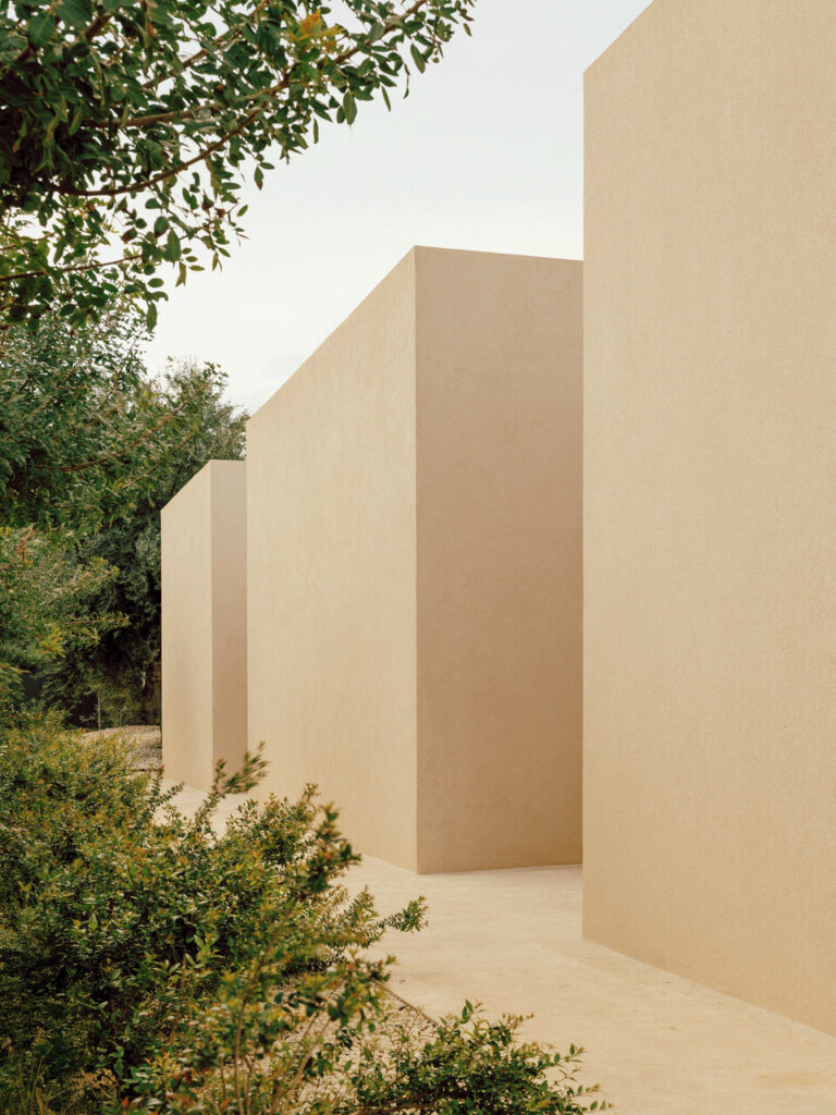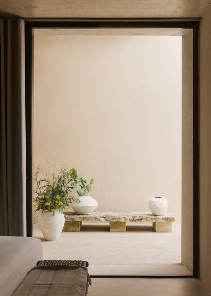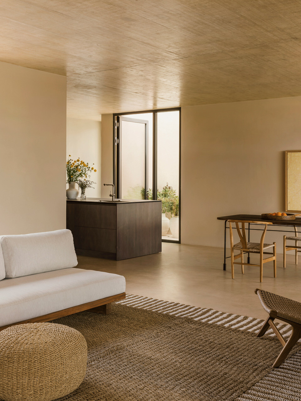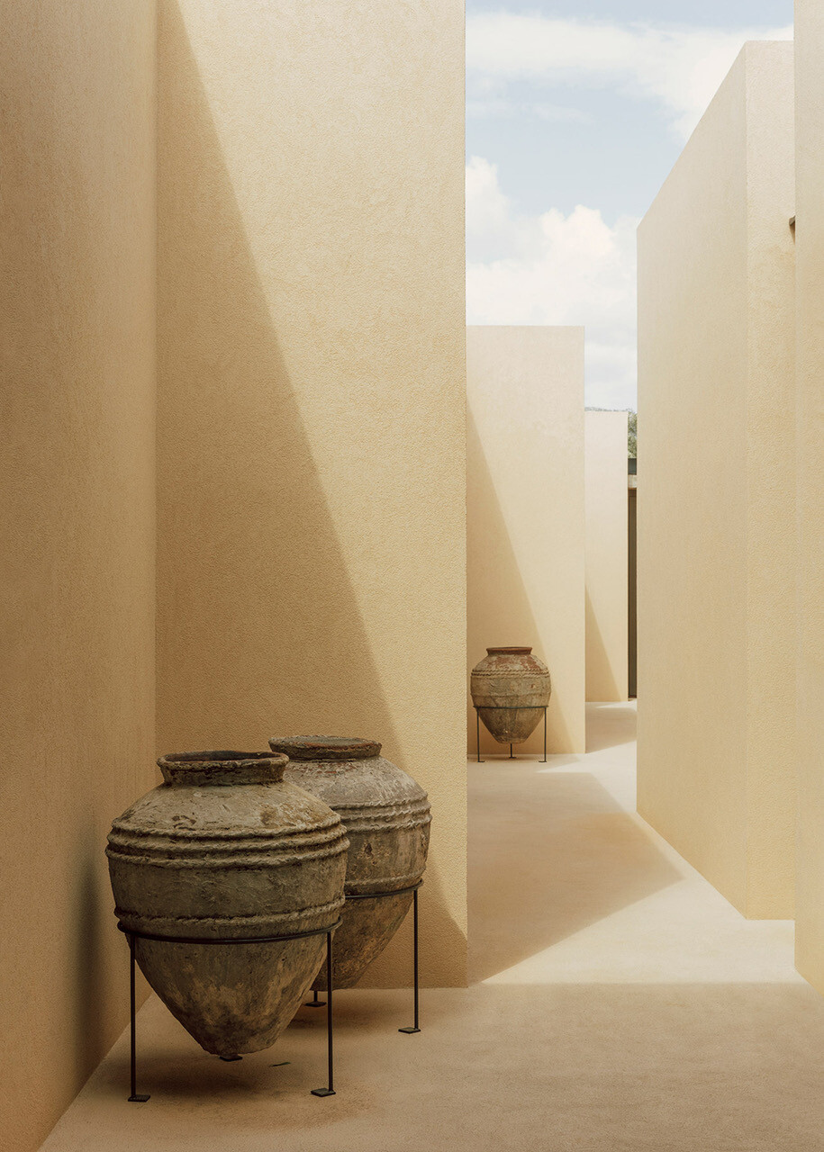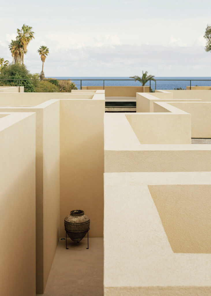As texturas e materiais definem a atmosfera serena do conjunto: paredes estucadas em tons terrosos, pavimentos em betão quente, pedra de Noto nos terraços e pedra vulcânica junto à piscina. Tudo fala a linguagem da contenção e da essência. Uma arquitetura que resiste ao tempo com elegância silenciosa.