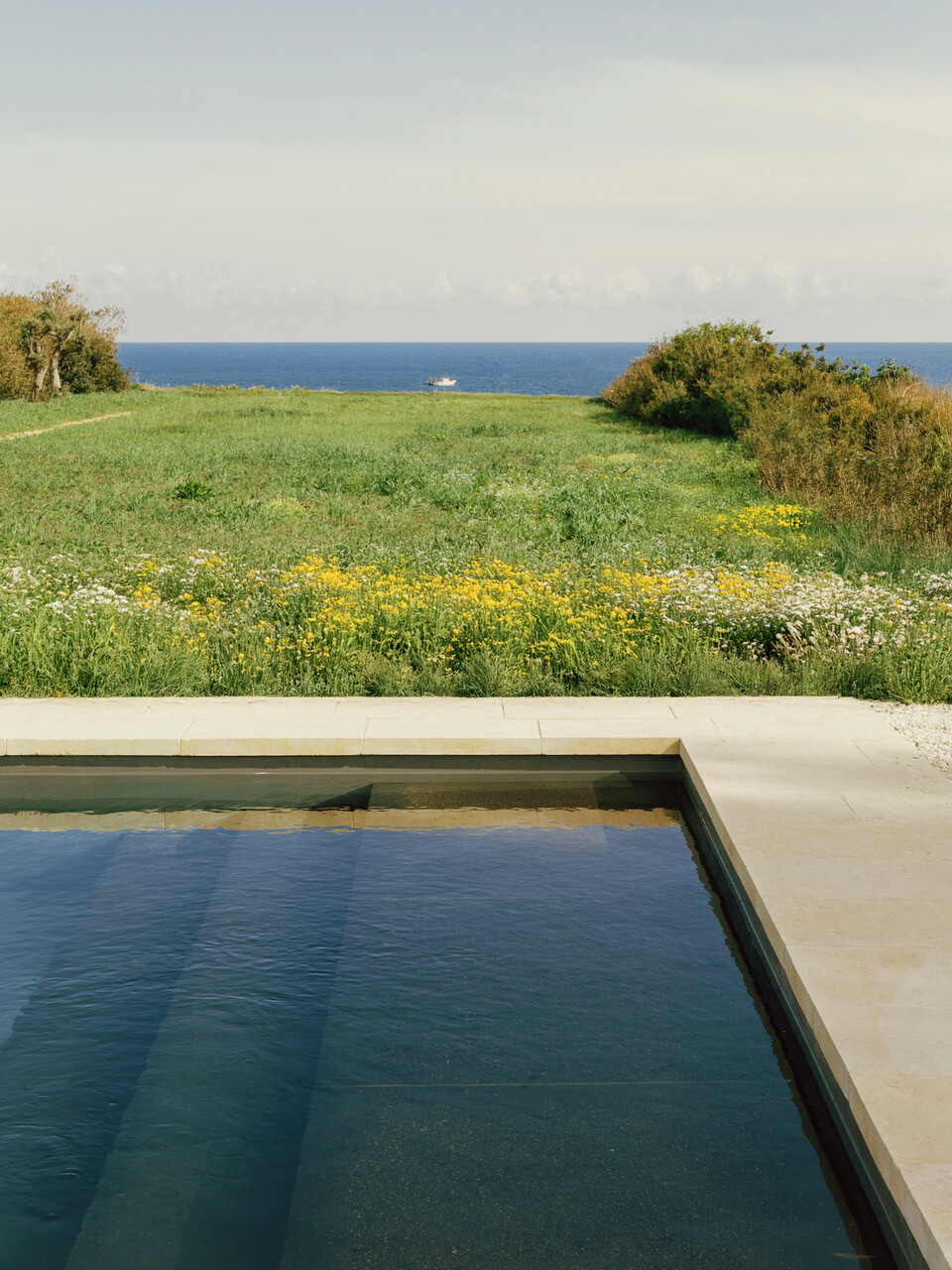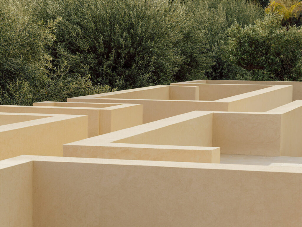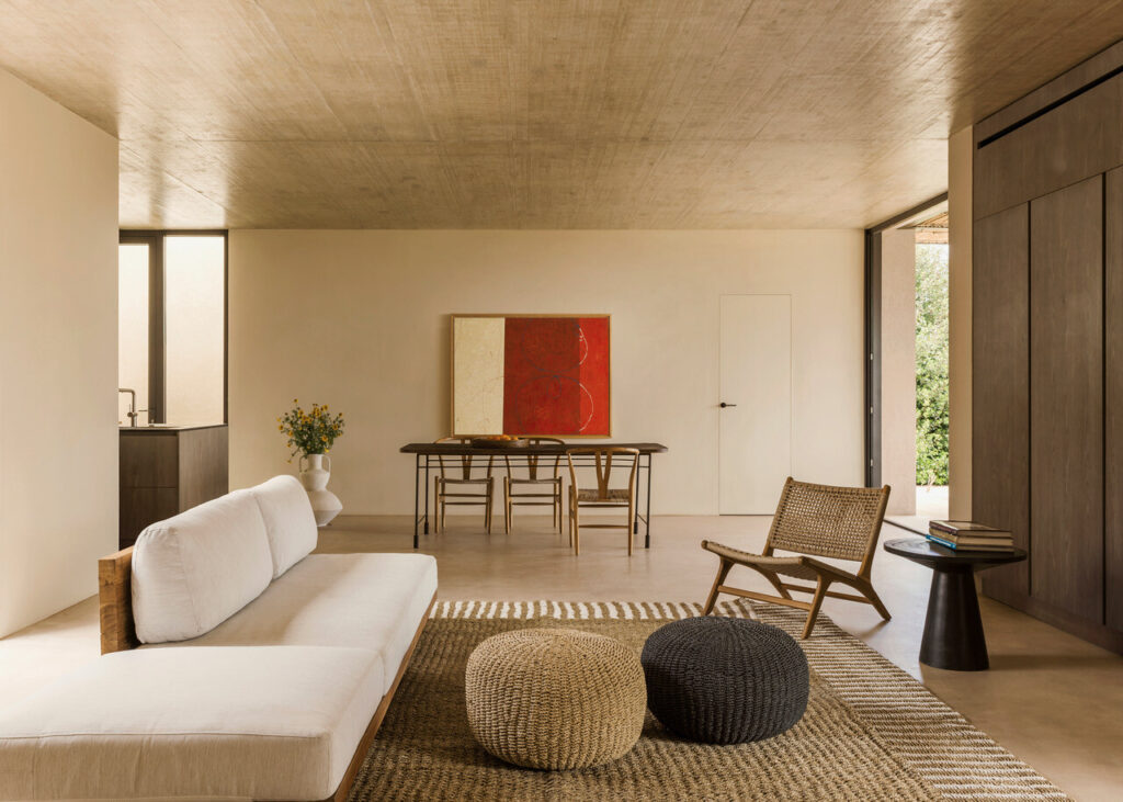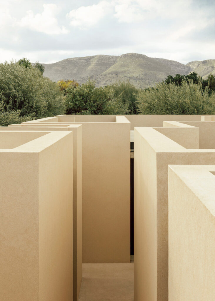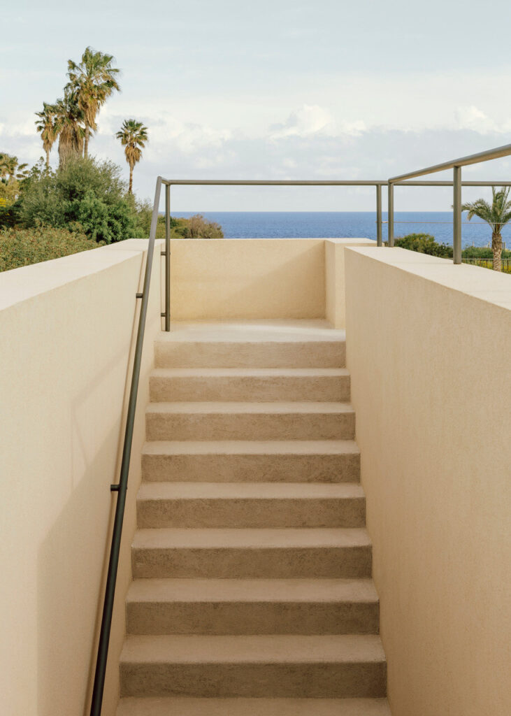 As texturas e materiais definem a atmosfera serena do conjunto: paredes estucadas em tons terrosos, pavimentos em betão quente, pedra de Noto nos terraços e pedra vulcânica junto à piscina. Tudo fala a linguagem da contenção e da essência. Uma arquitetura que resiste ao tempo com elegância silenciosa.