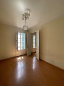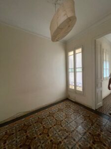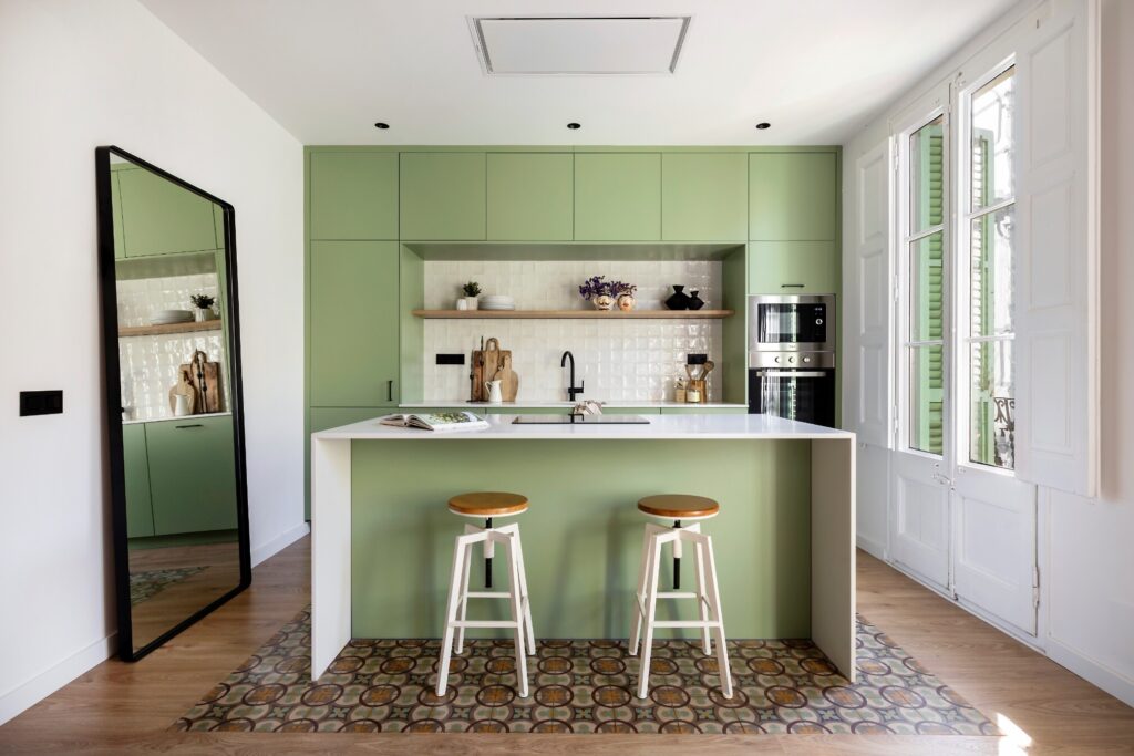 A cozinha é a protagonista: “optámos por mobiliário na cor verde pistácio, que combina com as portas da fachada principal e com os azulejos hidráulicos originais”, explicam. A sala está ligada diretamente à cozinha, e para integrar a zona multimédia, foi instalado um projetor e um ecrã oculto, com sistema de áudio embutido.