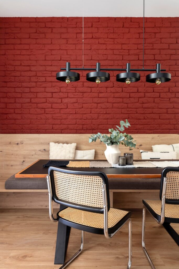 Além disso, foi também criado um espaço destinado exclusivamente à sala de jantar, que combina diferentes materiais, como um banco de carvalho e um revestimento de tijolos, que, juntamente com a iluminação, criam um ambiente muito interessante.