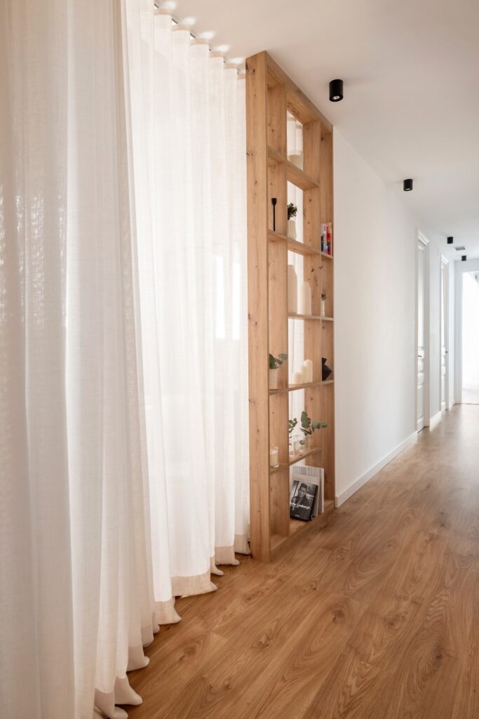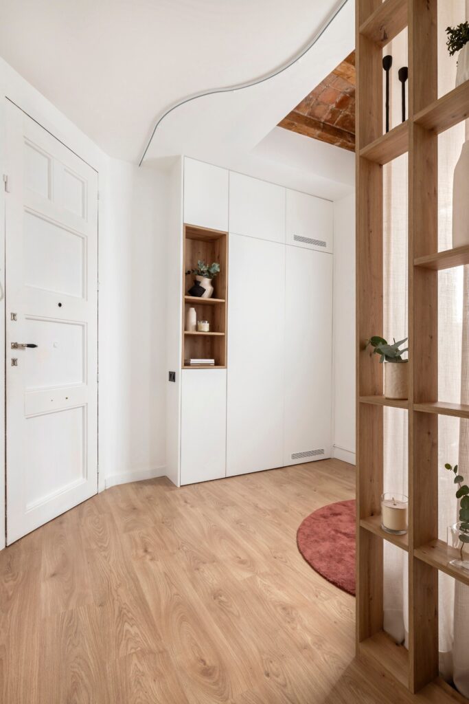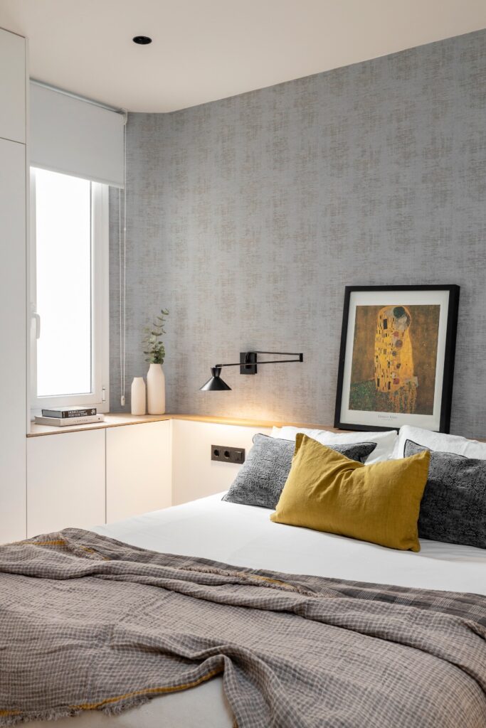 O quarto foi projetado com mobiliário inteiramente feito à medida para garantir um maior espaço de arrumação. A parede foi revestida com papel de linho, criando profundidade com os diferentes materiais. Por fim, a entrada dá as boas-vindas com uma grande janela luminosa, onde o Brákara criar um espaço multifuncional que, graças à cortina de linho integrada, pode ser transformado num ambiente mais íntimo para receber visitas pontuais.