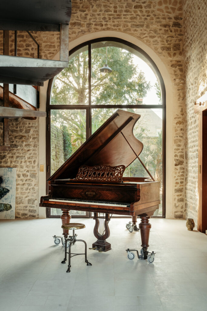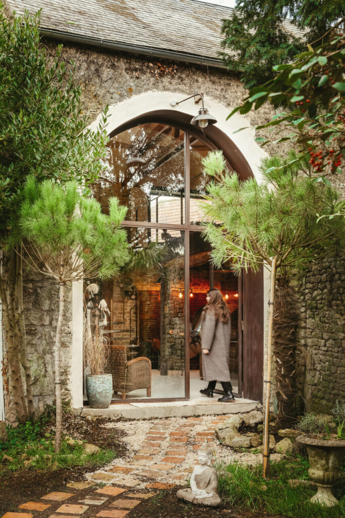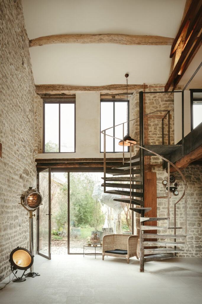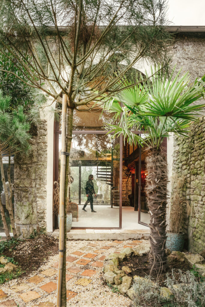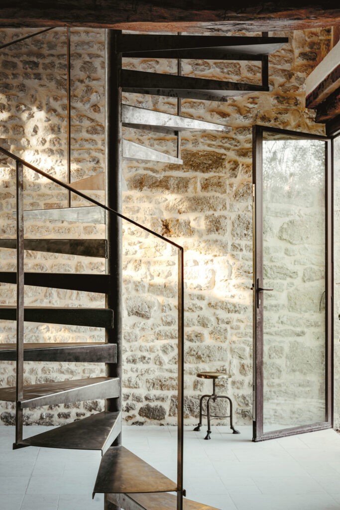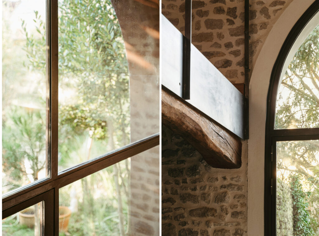 Estas aberturas permitem que os dois jardins de cada lado interajam, abrindo vistas da paisagem. As ferragens e os metais foram intencionalmente concebidos com aço fino para minimizar as intervenções contemporâneas no edifício e preservar ao máximo o caráter das fachadas de pedra seca exposta.