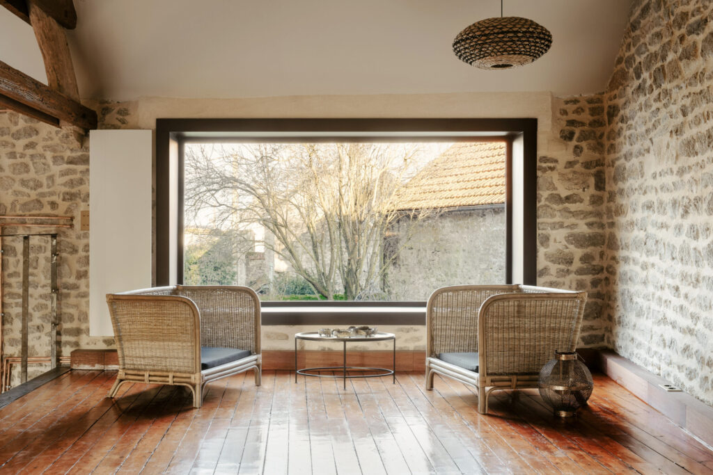 Estas aberturas permitem que os dois jardins de cada lado interajam, abrindo vistas da paisagem. As ferragens e os metais foram intencionalmente concebidos com aço fino para minimizar as intervenções contemporâneas no edifício e preservar ao máximo o caráter das fachadas de pedra seca exposta.