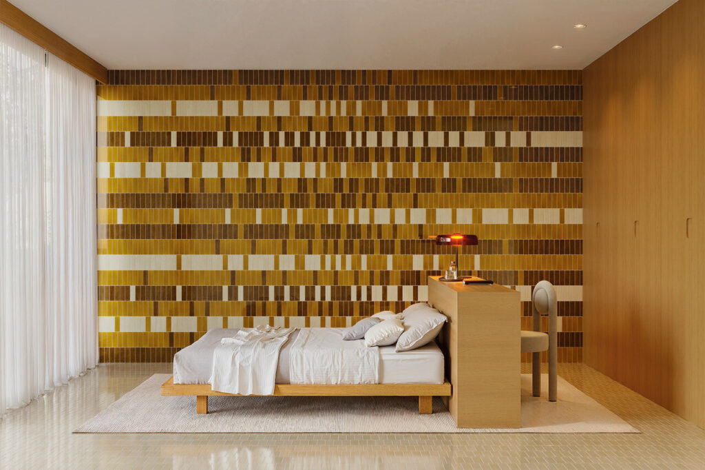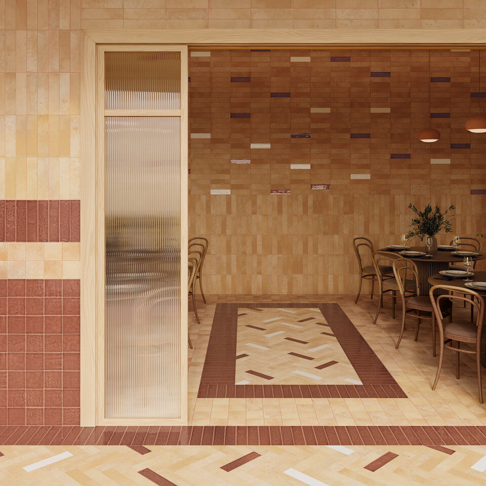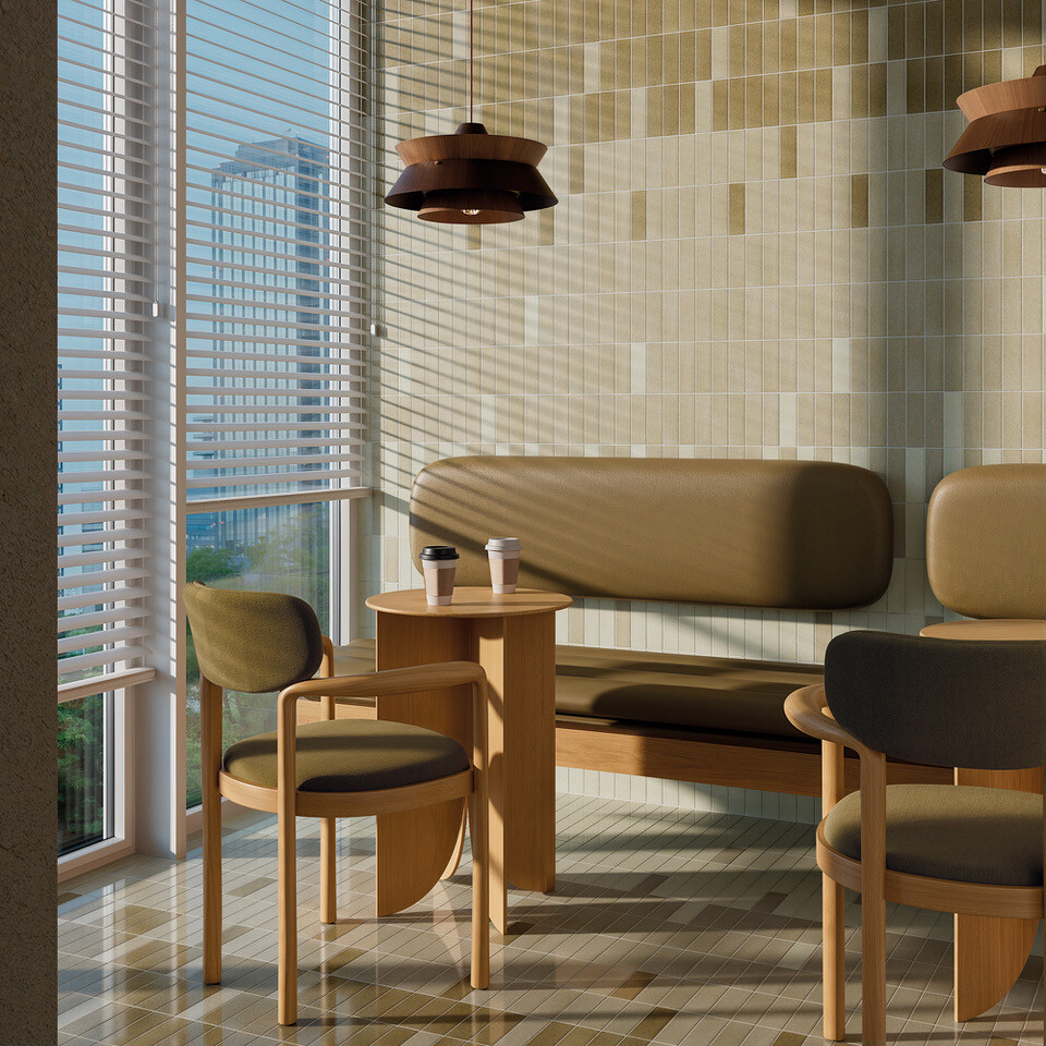 Inspirada nos anos 60 e 70, Micare revive a cerâmica esmaltada da época com um acabamento irisado subtil. Disponível em corpo porcelânico, no formato 5×15 cm, nas gamas Ambar, Alpi e Linen, com variações Light, Medium e Dark. Inclui ainda os relevos Rim e Canale, reforçando o estilo gráfico vintage.