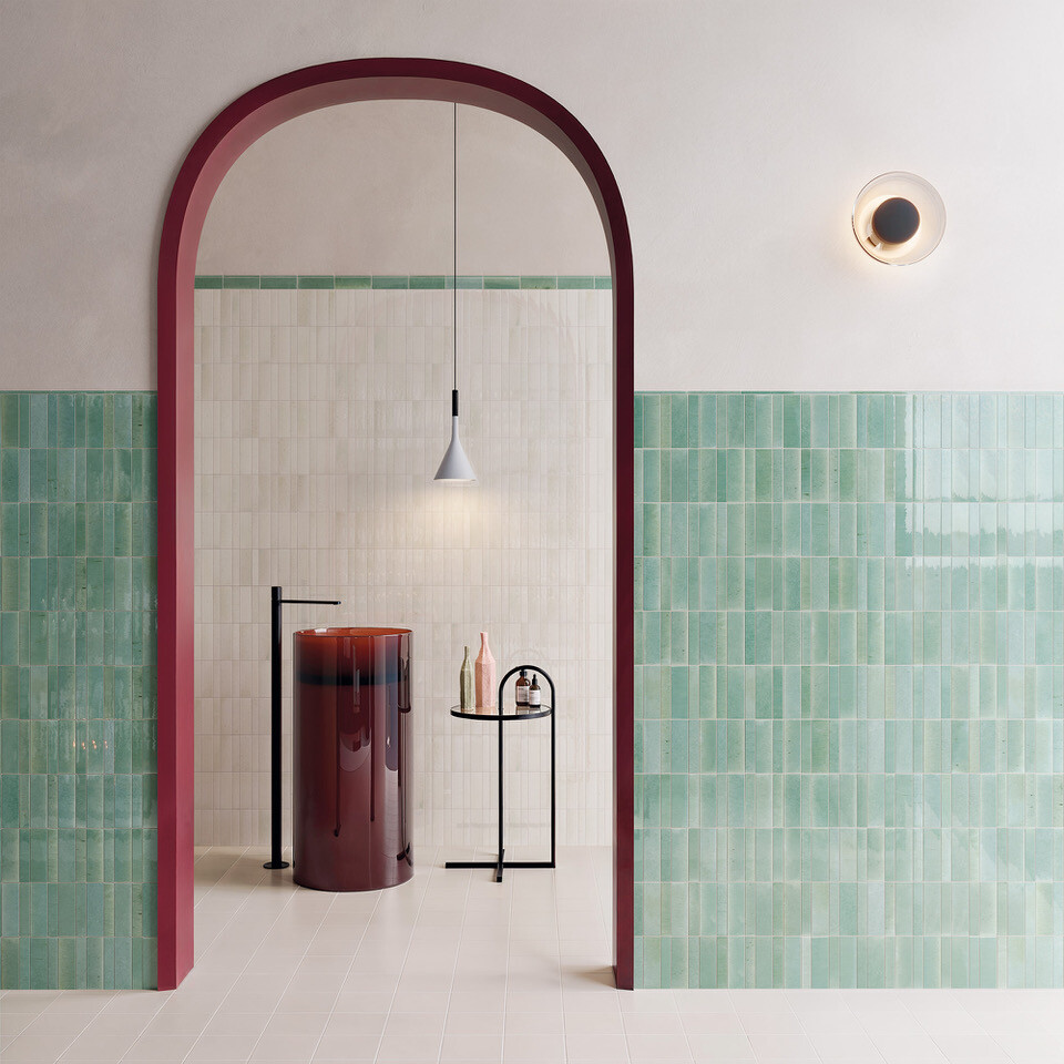 Sabil explora o esmalte e os relevos angulados para criar superfícies visualmente ricas. Disponível em 5×15 cm e 3×15 cm, com tons claros como Flour, Vanilla e Cloud, e verdes e azuis profundos, como Viridian, Jungle e Ultramarine, gerando reflexos e efeitos luminosos contínuos.