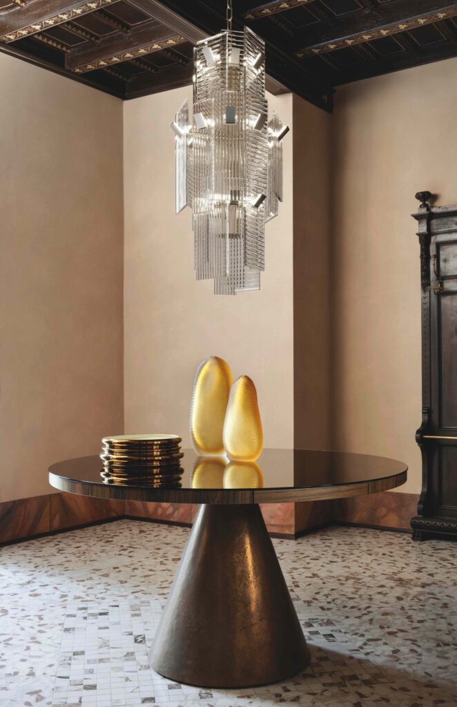 7. Lustre Coralia, da Venini, nas tonalidades Crystal e Moka, por Doriana e Massimiliano Fuksas, em vidro de Murano. Na QuartoSala.