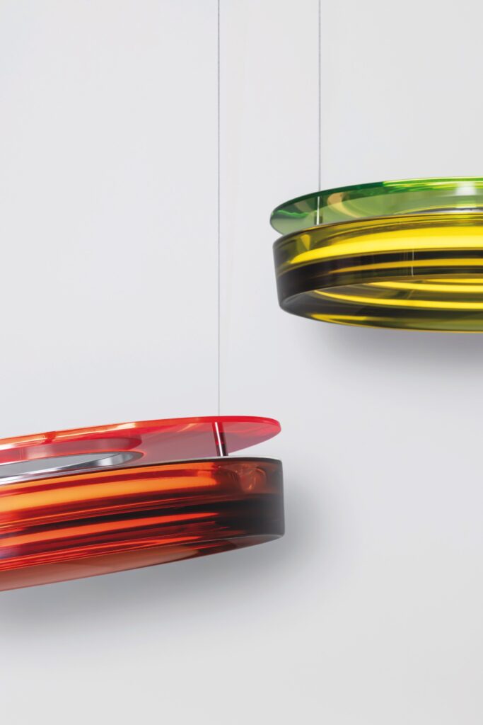 28. Frakki, a nova coleção de luminárias modulares assinada pelo arquiteto Michele De Lucchi para a Venini. Produzidas com a técnica de placa de vidro, disponíveis em duas variantes – uma mais estreita e outra mais larga –, as peças apresentam uma textura tridimensional em losango que refrata a luz, criando intensos jogos de reflexos. Na QuartoSala.