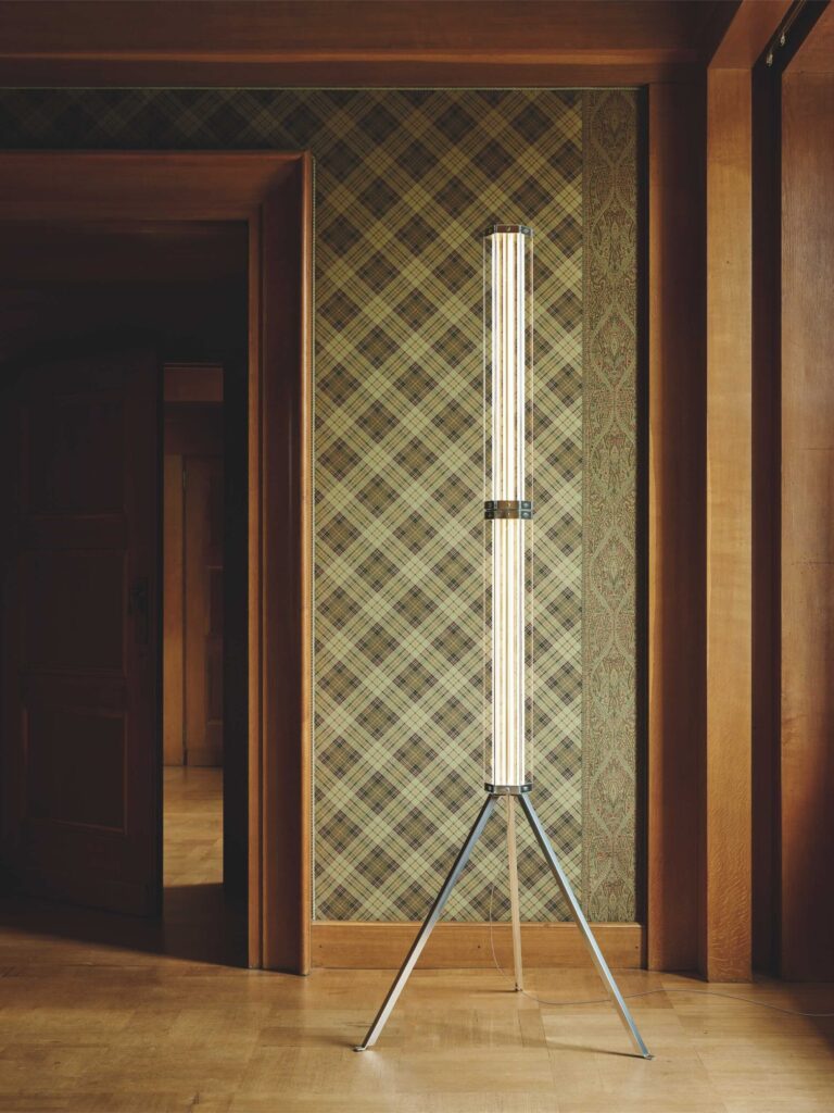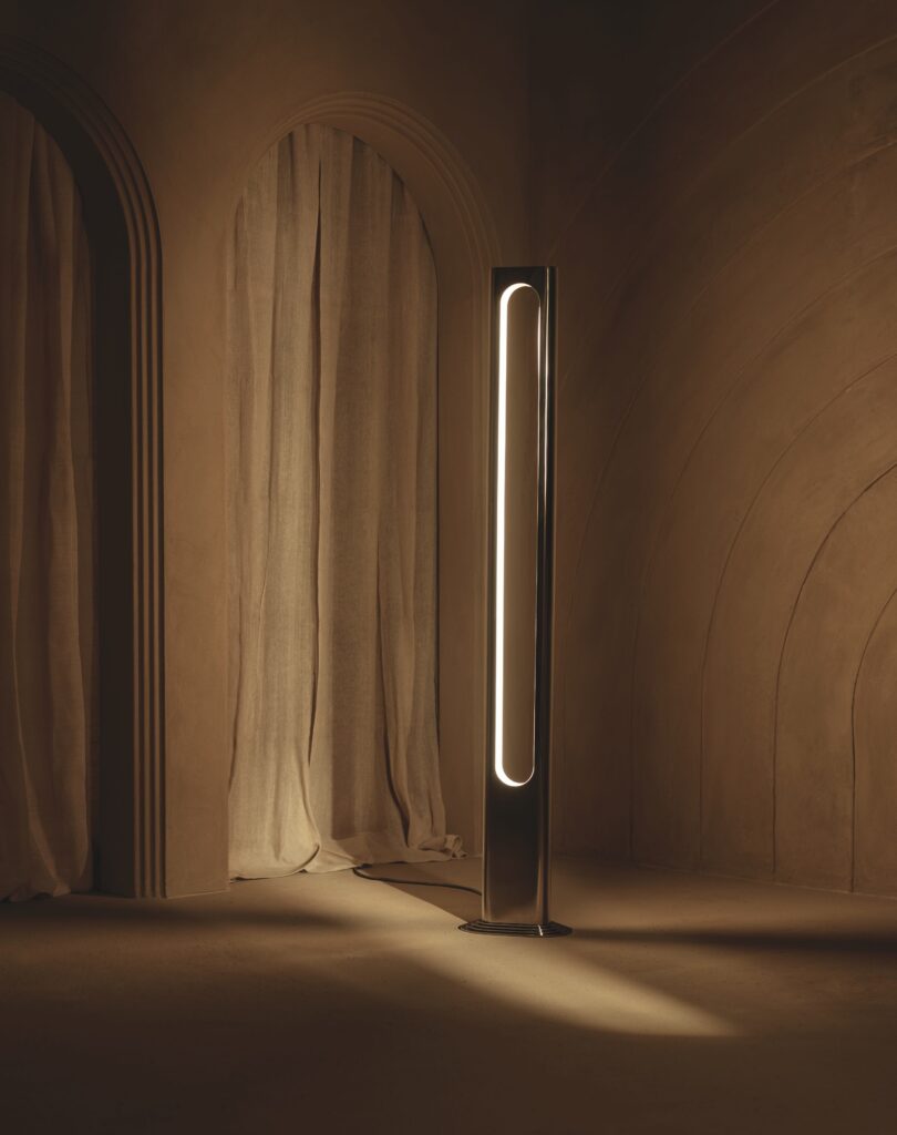 20. Delfi, da Linea Light Group, na versão de chão, disponível com fonte LED em 2700K ou 3000K. Inclui dimmer integrado ao painel da base. Na Jlux.