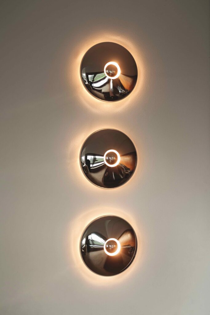 2. Andrea, a arandela de parede prossegue a narrativa da Tacchini sobre iluminação, combinando artesanato e materialidade numa peça decorativa e funcional. Aço com revestimento prateado PVD para um reflexo natural espelhado. Na QuartoSala.
