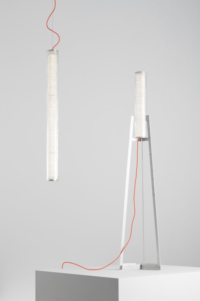 19. SuperWire, por Formafantasma para a Flos. Composta por um ou mais hexágonos de vidro unidos por um elemento em alumínio polido. A versão de chão é construída com dois módulos de 75 cm de altura, empilhados um sobre o outro, apoiados num tripé de aço. Na Servànt.
