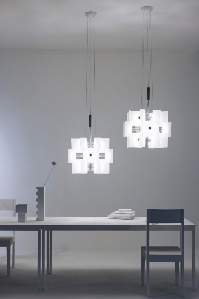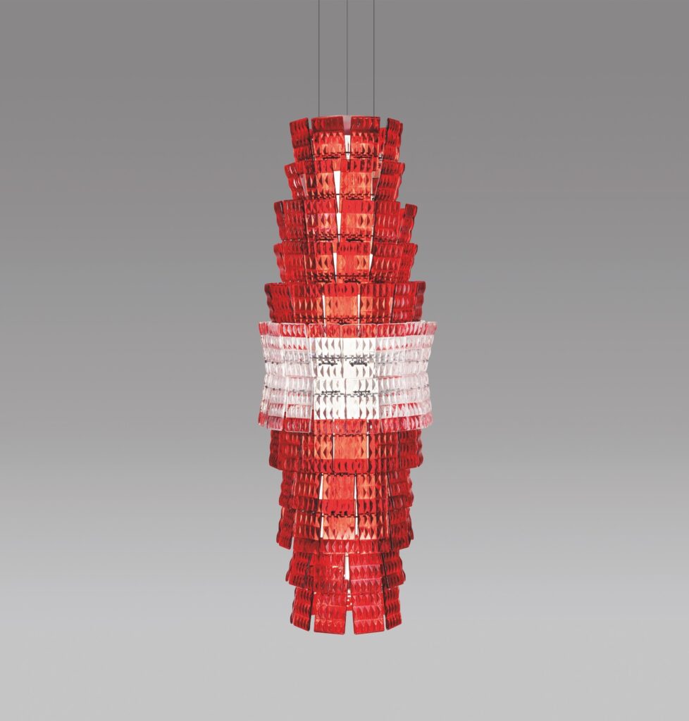 24. Bang, da coleção de outdoor da Slamp, com design de Adriano Rachele. Tem dez braços pentagonais de comprimentos variados que se estendem a partir do centro, irradiando luz por meio de recortes no difusor. Na Cena d’Arte.