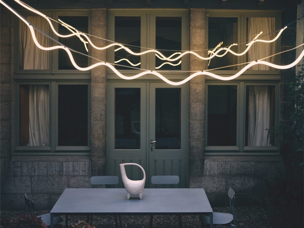 29. Sistema de suspensão Spline, por David Derksen para a Petite Friture, em dois modelos bicolores: castanho/laranja e bege/azul. Cada suspensão estende-se por mais de 4,5 metros. Modular, permite ajustar a curvatura, remover ou substituir a fita de LED para uma instalação personalizada. Na LX Design.