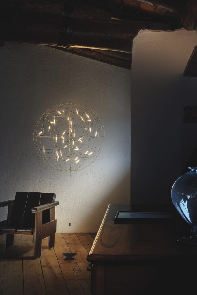 31. Pòta!, uma das novidades da Catellani & Smith, onde a luz é o ponto central em torno do qual se formam estruturas finas de latão, ao mesmo tempo volumosas e leves. Na Lenso.